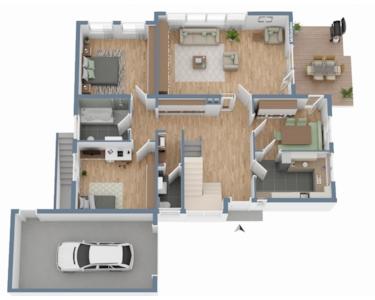 Das Erdgeschoss ist funktional und zugleich komfortabel in einen Wohn-/ und einen Schlafbereich aufgeteilt. Der Wohnbereich umfasst eine separate Küche mit direktem Zugang zum Esszimmer, ein großzügiges Wohnzimmer sowie ein Gäste-WC mit Fenster. In dem auf der Hausrücksete ruhig gelegenen Schlafbereich stehen zwei Schlafzimmer sowie ein modernes Tageslichtbad zur Verfügung.