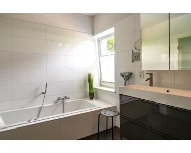 – Ein Bad mit bodenebener Dusche sowie Badewanne mit Whirlpool liegt gut erreichbar zwischen zwei Schlafzimmern.