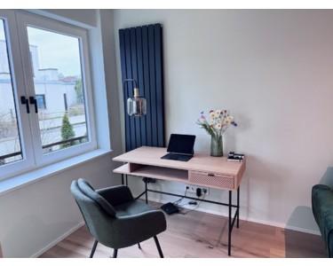 Ein eingerichteter Arbeitsplatz am Fenster ermöglicht komfortables Arbeiten von zu Hause. Ein Internetanschluss ist vorhanden; die Einrichtung eines Internetvertrags erfolgt durch den Mieter.