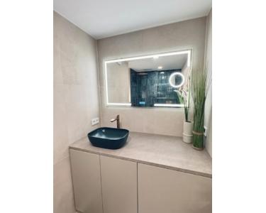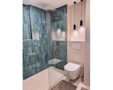 Das neu gestaltete Badezimmer überzeugt mit bodengleicher Dusche, hochwertigen Armaturen, vertikalen Fliesen in Grün-Blau-Tönen und einem hinterleuchteten Spiegel. Das Gesamtbild ist modern, ruhig und hochwertig.