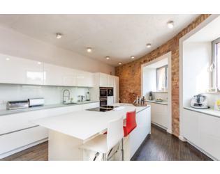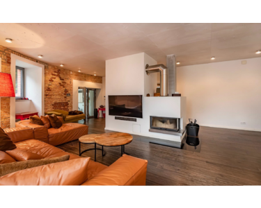Herzstück ist der großzügige, offen gestaltete Wohn- und Essbereich, der durch seine Weite und die besondere Gebäudeform ein einzigartiges Loft-Gefühl schafft. Hier entsteht ein stimmiger Rahmen für den Alltag ebenso wie für Empfänge oder gesellige Abende. Die moderne Einbauküche ist harmonisch integriert und bietet ideale Voraussetzungen für Kochen, Bewirten und gemeinsames Zusammensein.