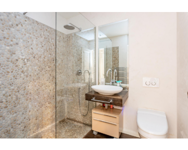 Der Sanitärbereich ist großzügig und hochwertig: Das Masterbad verfügt über Badewanne und Dusche, ein Doppelwaschbecken sowie ein Dusch-WC. Ein weiteres Gäste-Bad bietet Dusche, Waschbecken und Dusch-WC; ergänzend steht ein separates Gäste-WC zur Verfügung. Eine Umkehrosmose-Wasserfilteranlage sorgt für zusätzliche Wasserqualität. Praktisch und alltagstauglich ist zudem der Hauswirtschaftsraum mit Waschmaschine und Trockner.