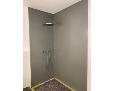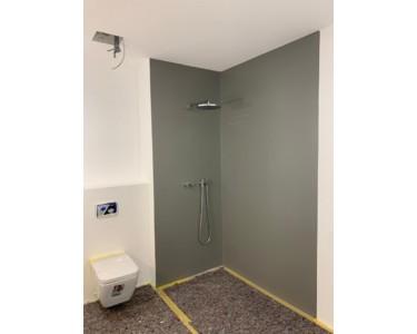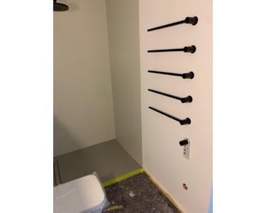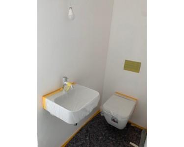 Ein fugenloser Senso-Boden unterstreicht den modernen, klaren Charakter der Räume. Die Bäder werden mit hochwertigen Armaturen von VOLA ausgestattet und fügen sich nahtlos in das anspruchsvolle Gesamtkonzept ein.
