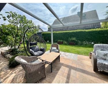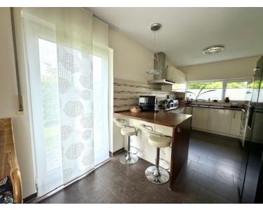 Die genaue Aufteilung und Ausstattung des Hauses ergibt sich wie folgt: Hausteil I - Eingangs- und Dielenbereich, ein hübsches Gäste-WC, ein gut geschnittener Hauswirtschaftsraum mit allen Anschlüssen z. B. für Waschmaschine und Trockner und die Wärmepumpe; eine sehr schöne Küche mit Esstheke - optisch vom Wohn- Essbereich abgeteilt - sowie das geräumige und helle Wohn- Esszimmer mit großen, bodentiefen Fensterflächen und Ausgang auf die mit einem Glasdach überdachte Terrasse und in den ideal nach Süd/Westen ausgerichteten Garten. Die Fläche in einer Größe von 476 m² ist liebevoll angelegt, mit einer Ligusterhecke eingefriedet und nicht einsehbar.