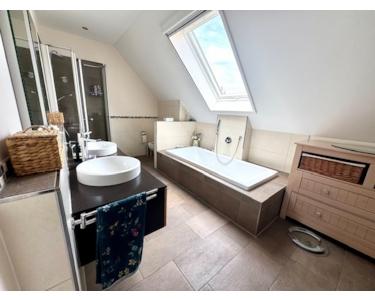 Eine gerade und geflieste Steintreppe führt in das 1. Obergeschoss. In dieser Etage befinden sich zwei helle und geräumige Kinderzimmer, ein schönes Gästezimmer, ein sehr großes Schlafzimmer mit abgeteiltem Ankleidebereich und ein geschmackvolles Badezimmer mit Doppelwaschtisch, Glasdusche, Badewanne und optisch abgeteiltem WC. Die Wohnfläche dieses Hausteils beträgt 152,37 m².