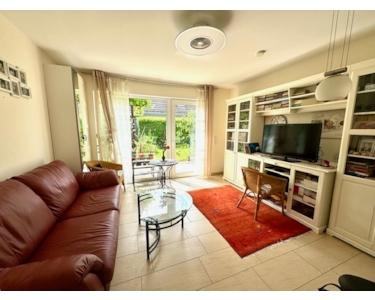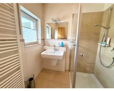 In dieser Wohneinheit gibt es einen kleinen Flur, ein Tageslichtbad mit Glasdusche, Waschtisch, Handtuchwärmer und WC, ein kleines Büro bzw. ein kleiner Schlafraum und ein hübsches und gut geschnittenes Wohnzimmer mit bodentiefer Fensterfläche und Ausgang auf die große Terrasse und in den Garten.