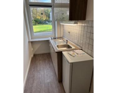 Die Wände sind frisch weiß gestrichen und der pflegeleichte Vinyl Fußboden ist neu verlegt.