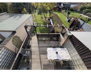 Im Erdgeschoss erwarten Sie eine moderne Küche und ein großzügiges Wohn- und Esszimmer mit direktem Zugang zu der außergewöhnlich großen, sonnigen Terrasse. Von hier genießen Sie den Blick in den gepflegten Garten – ideal zum Entspannen und für gemeinsame Stunden im Freien. Im Erdgeschoss befindet sich noch ein praktisches Gäste-WC.