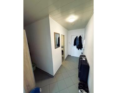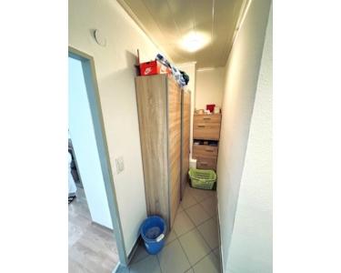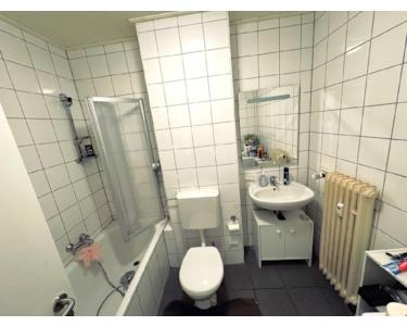 Ein kleiner Flur, von da aus ins Bad, das mit Badewanne ausgestattet ist, Waschmaschine und Trockner werden hier ebenfalls aufgestellt. Der andere Durchgang ins ca. 20m² große Wohnzimmer mit Ausgang auf den ca. 5m² großen West-Balkon.