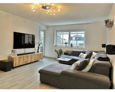 Das große Wohnzimmer ist hell und freundlich gestaltet. Der Zugang zum sonnigen Balkon schafft eine perfekte Verbindung von Wohn- und Außenbereich.