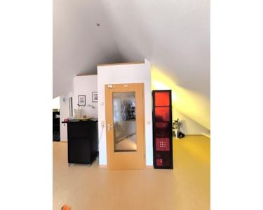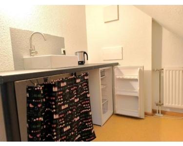 Linoleumfussboden im DG-Studio. Dort befindet sich eine kleine Teeküche mit Kühlschrank.
