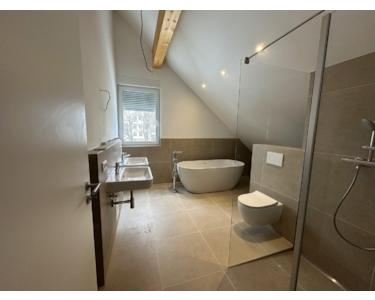 Die Wohnung besticht durch ihr offenes Raumgefühl mit Deckenhöhen von bis zu 5 Metern im Giebelbereich. Der energetische Standard KfW 40 EE sorgt in Verbindung mit der Wärmepumpe und der unterstützenden PV-Anlage für dauerhaft sehr niedrige Heiz- und Nebenkosten.