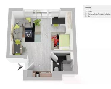 Es steht eine komplett ausgestattet Küche zur Verfügung, Bett, Schreibtisch, Sofaecke mit Gäste Bett, Esstisch, Kleiderschrank, TV, Radio, Kaffeevollautomat, .........