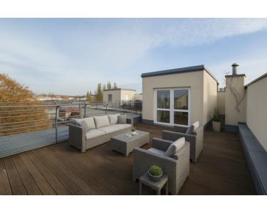 Eine markante Innentreppe führt in die obere Ebene, wo eine atemberaubende Dachterrasse auf Sie wartet. Von hier aus genießen Sie einen Panoramablick über die Berliner Skyline, einschließlich des Fernsehturms und des neuen Amazon Towers – eine inspirierende Kulisse zum Essen, Entspannen oder geselligen Beisammensein über den Dächern der Stadt.