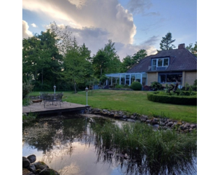 Das stattliche Wohnhaus liegt in der Mitte eines parkähnlichen Grundstücks, das man über einen Privatweg erreicht. Aus allen Räumen des modernisierten Hauses blickt man durch große Fenster auf das einladende Außengelände, zu dem Rasenflächen, zwei Teiche, drei Terrassen, gepflasterte Wege sowie ein großzügiger Parkplatz und eine lange Auffahrt zu einem Nebenhaus gehören.
