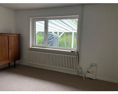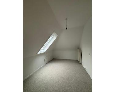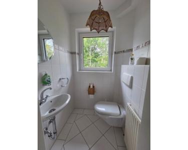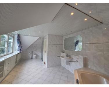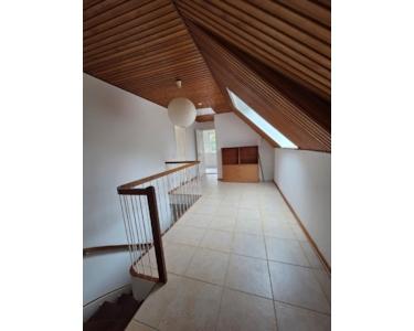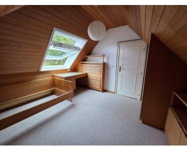 Das Obergeschoss ist aufgeteilt in ein großes barrierefreies Vollbad, drei kleinere Dachschrägräume, die z. B. als Kinderzimmer genutzt werden können, sowie ein großes Zimmer mit Holzfußboden, zu dem ein Balkon gehört.