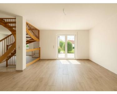 Bereits der einladende Eingangsbereich schafft eine freundliche Atmosphäre. Linker Hand befindet sich eine Garderobe mit ausreichend Platz, angrenzend ein praktisches Gäste-Bad. Eine elegante Glasschiebetür trennt die Diele vom großzügigen, offenen Wohn- und Essbereich. Das Wohnzimmer ist hell, geräumig und verfügt über einen charmanten Erkerbereich. Die moderne, offene Küche fügt sich harmonisch ein und bietet, ebenso wie der Wohnbereich, Zugang zur sonnigen Süd-Terrasse. Jalousien sorgen für eine angenehme Verschattung des Hauses. Das Highlight des Hauses ist die massive, maßangefertigte Holztreppe, die das Zentrum des Hauses bildet und ins Obergeschoss führt.