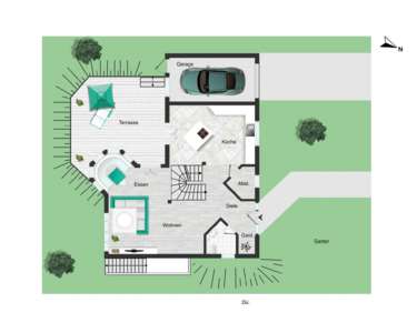 Zum Haus gehört eine angrenzende Garage mit elektrischem Rolltor sowie eine weitere, freistehende Garage auf dem Grundstück. Zusätzlich stehen drei weitere Außenstellplätze zur Verfügung. Der liebevoll angelegte Außenbereich mit Süd-Terrasse lädt zum Entspannen und Genießen ein.