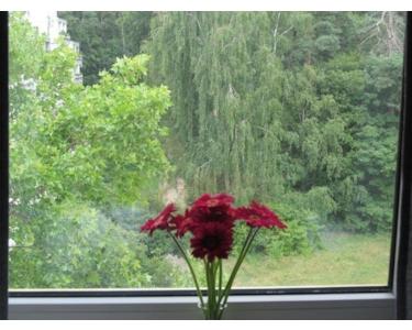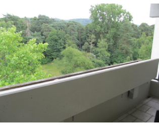 Sie betreten die Wohnung im 5. OG (vom Fahrstuhl eine halbe Etage über die Treppe!), wo Sie vom offenen und hellen Wohnzimmer und vom Balkon eine wunderschöne, grüne Fernsicht in die Berge erwartet. Die Küche hat eine moderne, weiße Einbauküche mit allen Geräten, Wasch- und Spülmaschine und Geschirr. Es gibt ein schönes Schlafzimmer, sowie ein Badezimmer mit Badewanne, WC und Waschtisch. Von allen Fenstern gibt es einen Blick in den Wald.