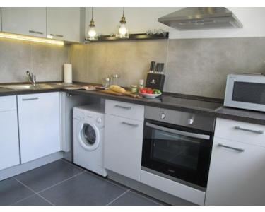 - große Einbauküche m. E-Herd, Backofen, Spülmaschine, Waschmaschine, Kühlschrank, Gefrierschrank, Mikrowelle, Geschirr