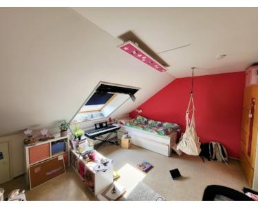 Ober- und Dachgeschoss wurden 2021 renoviert. Hier befinden sich im Obergeschoss drei Schlafzimmer und ein Badezimmer mit Badewanne und Dusche. Im Dachgeschoss befindet sich neben zwei hellen Schlafzimmern auch die Gastherme mit einem Warmwasserspeicher von 300 Liter.
