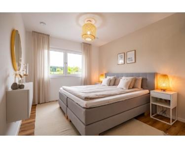 Erleben Sie gehobene Ausstattung, die keine Wünsche offenlässt. Der Bungalow verfügt über zwei Schlafzimmer und ein luxuriöses Badezimmer mit Dusche, Wanne und Fenster sowie ein zusätzliches Gäste-WC. Die Bodenbeläge sind wahlweise aus hochwertigen Fliesen oder nach Ihren individuellen Vorstellungen gestaltbar, was Ihrem Zuhause eine persönliche Note verleiht. Eine moderne Wärmepumpe sorgt für effiziente Beheizung und erfüllt den KFW40 Standard, was Ihnen langfristig Energiekosten spart,plus BNK.