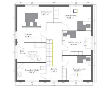 Im Erdgeschoss bildet der offen gestaltete Wohn-, Ess- und Kochbereich mit 61 m² das Herzstück des Hauses. Der gesamte Wohnbereich wird von drei Seiten mit Tageslicht durchflutet. Die Küche ist über Eck angeordnet, so kann sie nicht direkt vom Flur oder vom Wohnbereich aus eingesehen werden. Weiterhin befinden sich ein optionales Duschbad, ein Haustechnik-/Hauswirtschaftsraum, eine schöne Diele sowie ein praktisches Zusatzzimmer (Gäste/Hobby/Schlafen/Kind) im Erdgeschoss. Der Grundriss ist so konzipiert, dass auch bei Krankheit oder im Alter das Wohnen auf einer Etage möglich ist. Das Obergeschoss ist mit drei Kinderzimmern und einem Kinderbad geplant. Der Elternbereich überzeugt mit einem Ankleidebereich und einem Bad en Suite. Der Flurbereich ist als Galerie ausgestaltet.