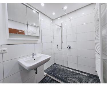 Die moderne Einbauküche ist voll ausgestattet inkl. Spülmaschine, Kaffeemaschine, Wasserkocher und sämtlichen Küchenutensilien. Frisch saniertes Bad mit Dusche sowie separates Gäste-WC.