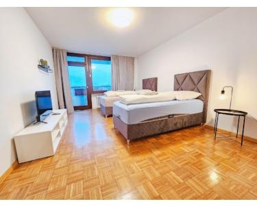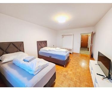 Die Wohnung bietet zwei voll möblierte Schlafzimmer mit Boxspringbetten mit Smart-TV, ein Esszimmer mit Esstisch und Stühle. Von einem Zimmer hat man Zugang zum Balkon.