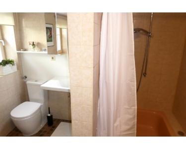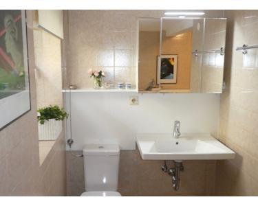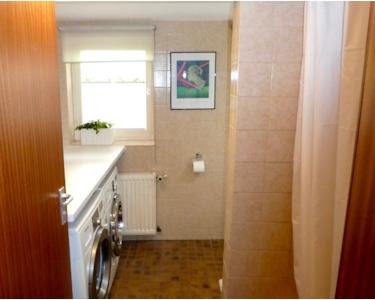 mit Dusche, WC und Waschbecken, Waschmaschine und Trockner, Spiegelschrank und weiterem Stauraum.