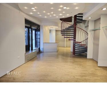 Die Einheit ist mit diversen Kleiderstangen und integrierten Schubladen ausgestattet. Der große Verkaufsraum, eine kleine Büroecke und ein Abstellraum befinden sich im Erdgeschoss. Auch die Toilette ist hier zu finden. Im Obergeschoss befinden sich zwei weitere Räume.
