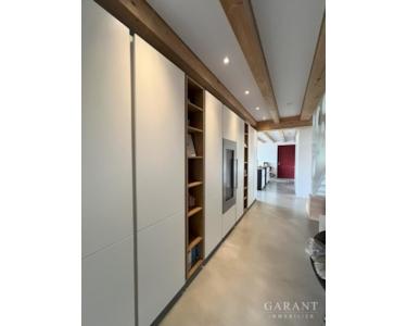 Das Herzstück bildet der offene Wohn- und Essbereich mit einer exklusiven Einbauküche, ausgestattet mit hochwertigen Geräten, einem integrierten Weinschrank und edlen Oberflächen.