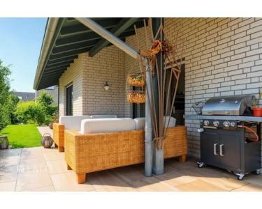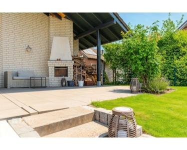 Über die Küche erreichen Sie eine kleine Seitenterrasse, während Sie vom Wohnzimmer oder Wintergarten auf die überdachte Hauptterrasse mit Außenkamin gelangen – perfekt für gesellige Abende und entspannte Stunden im Freien.