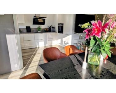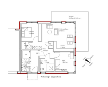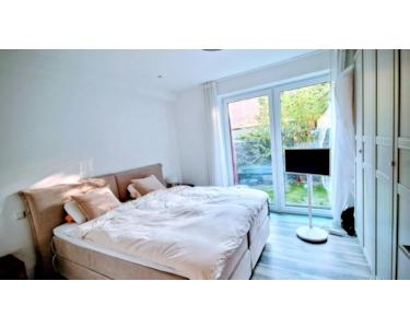 Die Wohnung besticht durch Nobilia-Einbauküche, Terrasse mit direktem Zugang zum eingefriedeten Garten, großen Kellerraum (ca. 14 m²) und weitere Gemeinschaftsräume. Bodentiefe 3-fach verglaste Fenster mit elektrischen Jalousien, Fußbodenheizung und moderner Design-Vinylbelag sorgen für Helligkeit und Wohlbefinden. Das Gebäude erfüllt den KfW 55-Standard (A+) und wird mit einer Luftwärmepumpe beheizt.