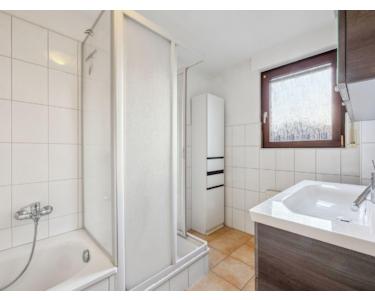 Das Badezimmer verfügt über eine Badewanne sowie eine Dusche. Das WC ist ausgelagert in einen separaten Raum.