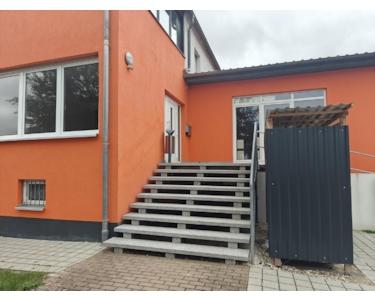 Die Einheit befindet sich im Erd-/Hochparterre eines Bestandsgebäudes und ist über Rampe und Treppe erreichbar.