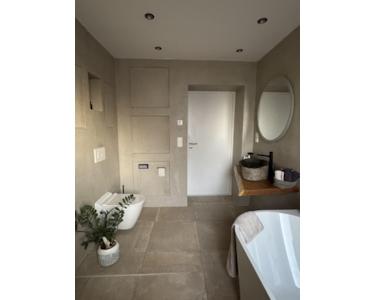 - Hochwertiges Badezimmer mit Badewanne, großem Duschbereich, WC und praktischen Einbauschränken – dazu pflegeleichte, feuchtraumgeeignete Wände