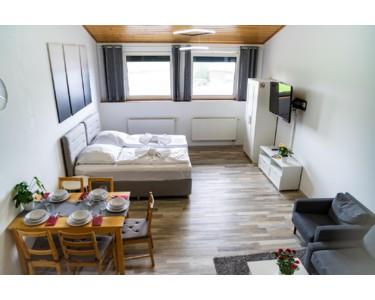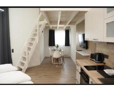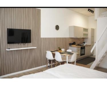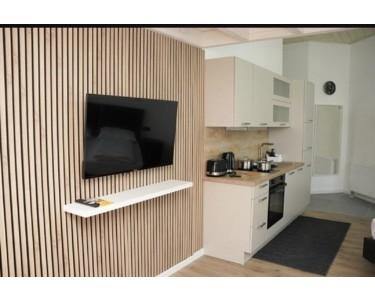 Alle Apartments sind vollständig möbliert und ausgestattet mit Doppelbett/Boxspringbett, Schrank, Esstisch und Stühlen, TV, moderner Einbauküche (Herd, Backofen, Kühlschrank, Wasserkocher, Toaster, Geschirr und Grundausstattung) sowie eigenem Badezimmer mit Dusche. WLAN und Parkplatz sind im Preis enthalten.