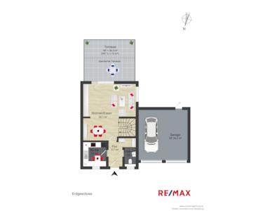 Das Erdgeschoss begrüßt Sie mit einer freundlichen Diele. Von hier aus gelangen Sie in die Küche mit moderner Einbauküche sowie in den offenen Essbereich – ein Ort für Familienmomente, Gespräche und gemeinsame Mahlzeiten. Der angrenzende helle Wohnbereich führt direkt zur überdachten Terrasse und öffnet den Blick ins Grüne. Perfekt für entspannte Abende, Sommerfrühstücke oder gesellige Stunden mit Freunden.