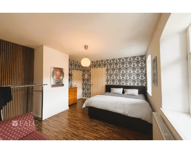 Im Obergeschoss setzt sich mein Charakter fort. Das Wohnzimmer vereint historische Ornamentdecken, Kaminofenwärme, kunstvoll verzierte Gusseisenbalkone und stimmungsvolle, warme Beleuchtung. Hier atmet jede Fläche Geschichte, ohne zu verstauben – eine mit Zeitungsseiten gestaltete Wand wirkt modern, erzählt jedoch in ihren Zeilen von meiner Kindheit und überrascht selbst Kenner. Nebenan liegen ein weiteres Zimmer mit Balkon zum südlichen Innengarten, ein Gäste-WC sowie ein neu geschaffenes, großzügiges Bad in moderner Optik. Walk-in-Dusche, Badewanne, Doppelwaschbecken, Holzakzente, Balkonzugang und vorbereitete Fußbodenheizung verbinden Komfort und Geborgenheit – mit direktem Übergang in ein ruhiges, warmes Schlafzimmer.