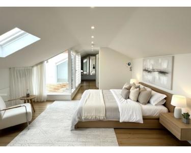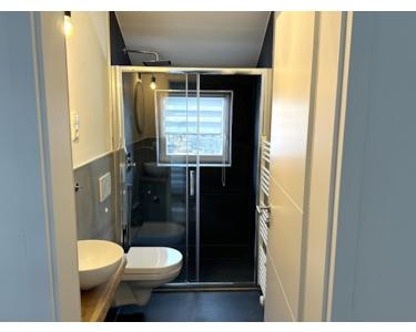 Über einen Treppenaufgang erreichen Sie das 2.OG. Eine Wellnessoase mit hochwertigen Materialien ausgestattet beeindruckt durch eine große begehbare Dusche, eine freistehende Badewanne sowie einer Klimaanlage.