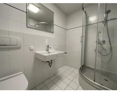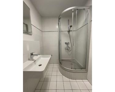 Das Badezimmer bietet einen modernen Waschtisch, ein Wandhänge-WC und eine geräumige, halbrunde Eck-Dusche (90x90 cm) mit Glasabtrennung, raumhohe weiße Fliesen und einen Flachheizkörper. Das Bad ist innenliegend mit einer Entlüftung über mechanische Luftabsaugung.