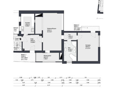 Die Aufteilung ergibt eine klassische 2,5-Zimmer-Wohnung, ergänzt um Wintergarten und offene Blickbezüge.