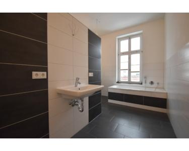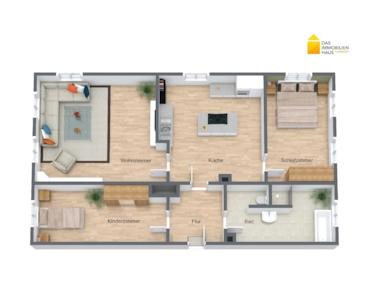 Hochparterre, Flur, Bad mit Wanne, Dusche, WC, Handwaschbecken und Fenster, Schlafzimmer, Küche mit Fenster, Einbauküche, Wohnzimmer und Kinderzimmer