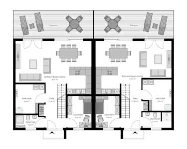Die Hausarchitektur des Doppelhauses/der Doppelhaushälfte mit Walmdach strahlt moderne Eleganz aus. Die Grundrissgrößen sind so geplant, dass komfortable Räumlichkeiten entstehen.