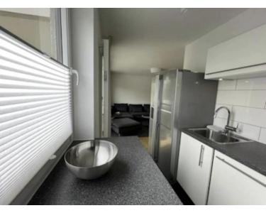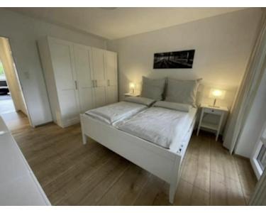 Bad mit Miele-Waschmaschine/Trockner und Badewanne. Schlafzimmer mit Schreibtisch und Balkon, Küche (alles Bosch) mit Tisch und Speisekammer und Wohnzimmer mit Schreibtisch, Samsung TV und Sofa.