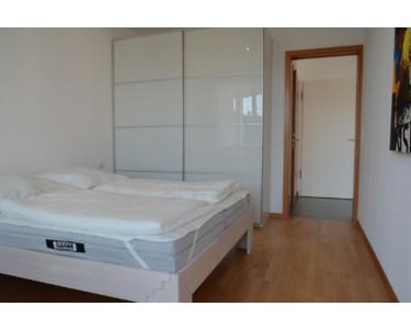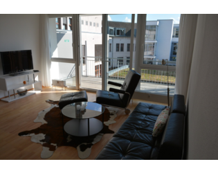 Die Wohnung ist sehr hell mit bodentiefen Fenstern und Balkonschiebetüren sowie modern eingerichtetem Wohnbereich mit Ledercouch und Sessel, Smart TV, Kabelfernsehen (gegen Gebühr). Ein kleiner Esstisch fügt sich an die großzügige voll eingerichtete Küche an.