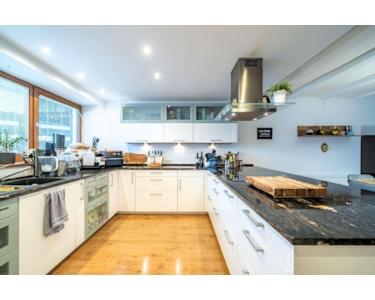 Der offen gestaltete Wohn- und Essbereich mit rund 65 m² beeindruckt nicht nur durch Großzügigkeit, sondern durch stimmige Details: eine exklusive Beckermann-Küche mit edler Granitplatte und hochwertigen Einbaugeräten im Wert von über € 30.000,--. Ein stilvoller Kamin geschaffen für entspannte Abende mit Freunden oder ruhige Stunden.
