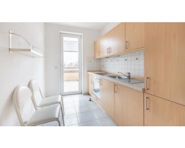 Die an das Wohnzimmer angrenzende Küche ist mit einer Einbauküche im hellen Holzdekor ausgestattet und bietet Ihnen ebenfalls den Zugang auf die Dachterrasse.