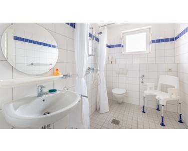 - hell gefliestes, barrierefreies Duschbad mit Fenster